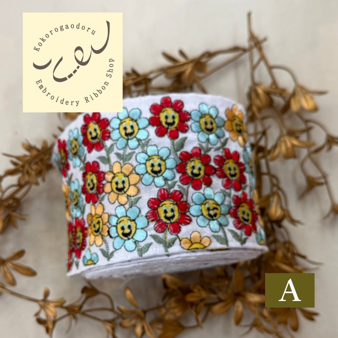沢山の笑顔のお花が描かれた刺繍リボンです。