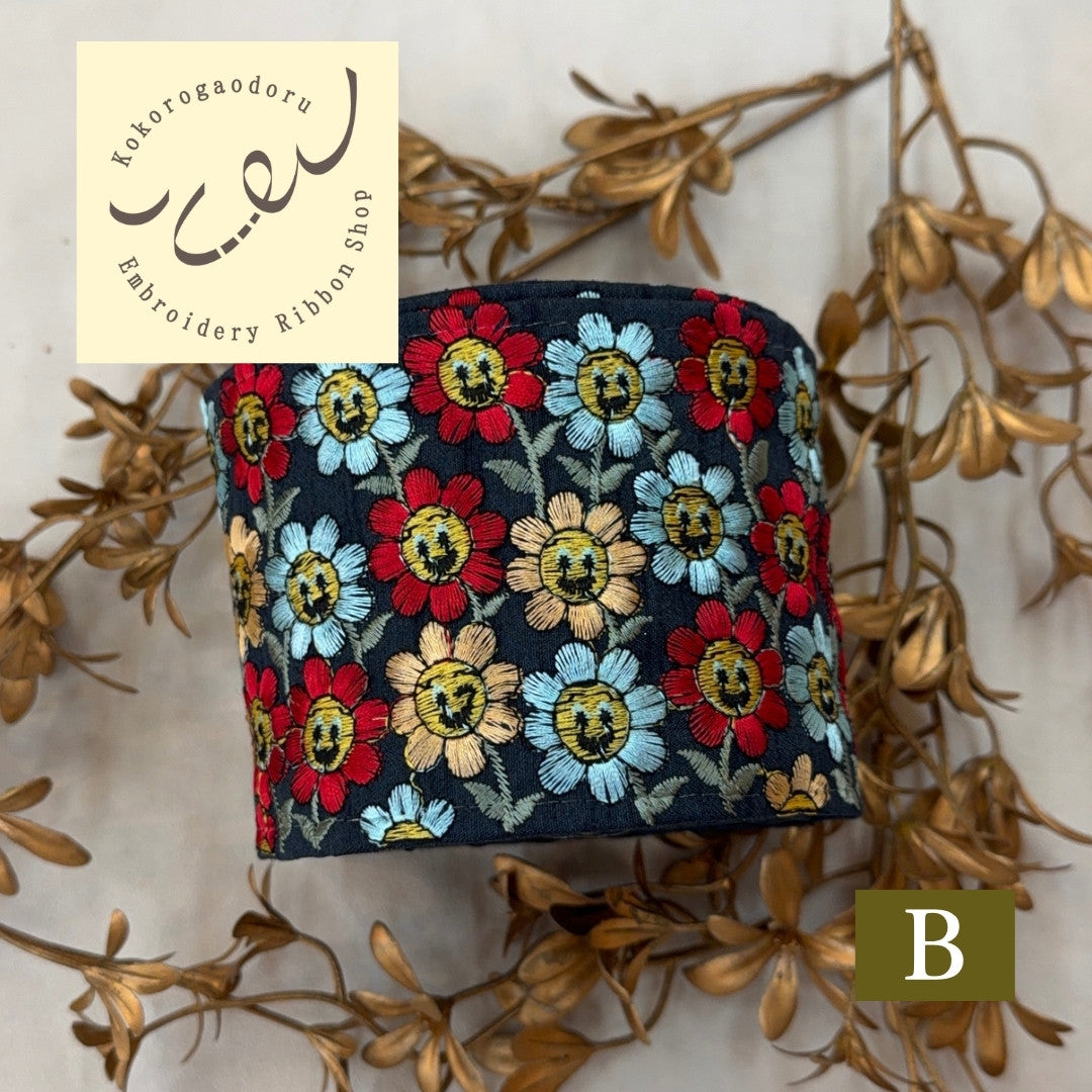 【50cm単位】刺繍リボン 広幅 幅広 太幅 インド刺繍リボン ノンスパンコール 布地 お花の笑顔に魅せられて 幅約8.9cm 251031001