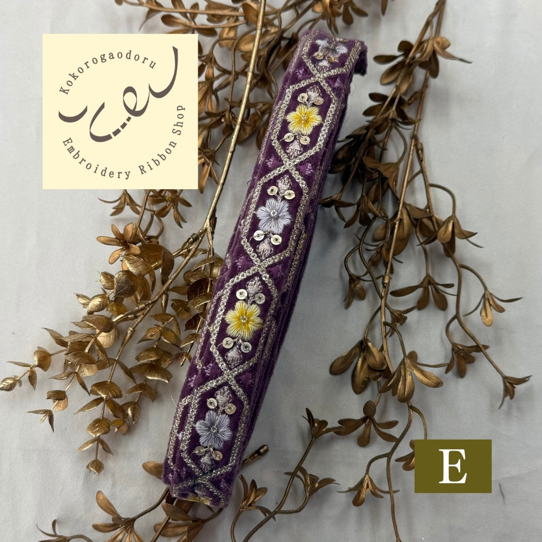 【50cm単位】刺繍リボン 細幅 インド刺繍リボン スパンコール 布地 ポーチュラカ夫人のベルベット 幅約2.7cm 251208001