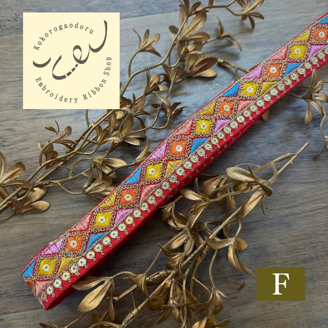 【50cm単位】刺繍リボン 細幅 インド刺繍リボン スパンコール チュール 布地 赤い刺繍リボンに恋して 幅約2cm~5cm 260206001